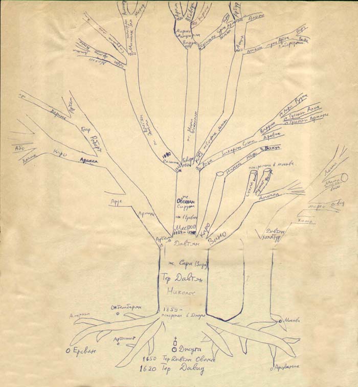 Еще будучи студентом, я со слов своих бабушек, составил родословную родов своих как бабушек так и дедушек. Потом муж папиной сестры профессор Александр Варданович Захарян подарил мне книгу про Ованеса Тер-Давтяна – купца и путешественника из Новой Джуги (Иран), который оставил свои воспоминания о древнем Непале (он был одним из первых путешественников оставившем воспоминания о Непале), и дневники которого издал Матеданаран. Александер Вартанович подарил мне книгу со словами – Я вижу, что и ты, как и твой далекий родственник, одержими страстью к путешествиям (я тогда уже имел 1 разряд по пешеходному туризму и обошел пешком с палаткой пол Армении и Алтайский край). Я думаю корни этого рода происходят из старой Нахичеванской Джуги, откуда родом мой дед, и скорее всего эта одна из ветвей нашего рода.